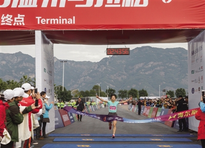 时针指向10点43分,终点拐角处出现了一个瘦小的身影。主持人播报:“女子全程冠军马上要接近终点了。”