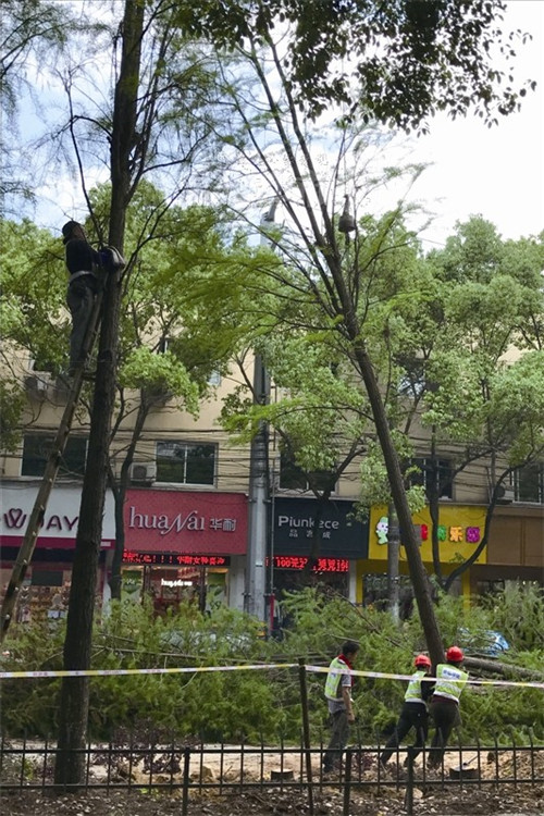 前天下午,记者在现场看到,梧慈路部分路段已被警戒线隔离,施工人员正在使用电锯砍伐杉树。