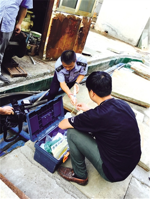 前日,龙湾环保执法人员在企业采样。张琳摄