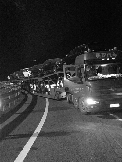 10月29日凌晨3时许,杨某驾驶一辆轿运车在温州南下高速时,卡在了匝道内进退不得,随即杨某报警求助。温州高速交警三大队民警立刻赶到现场,只见一庞然大物停于匝道,堵住了后方车辆,该轿运车上装了两排小轿车,有20多辆。据现场交警介绍,因为轿车在经过该路段准备转弯时,司机操作没到位,不慎让右侧车身跟护栏发生了刮擦,结果车右后轮陷入边护栏内,车尾就和护栏卡在一起了。