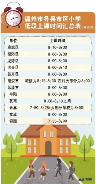 据市教育局基教处提供的有关数据,在新政实施前,瓯海区、龙湾区小学低段上课时间为8:00到8:30,瑞安城镇为8:15到8:30,农村大部分为8:00。新政实施后,各县(市、区)于今年春季起在有条件的学校试点推迟上学。