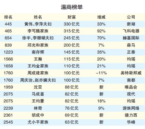 除美特斯邦威周成建家族因股价低迷,身家缩水11%之外,此次上榜的温商,财富均呈增长状态。其中飞科电器的实际控制人李丐腾家族财富涨幅达到92%,以315亿元排名温商第二位;赫基国际的徐宇、李珊瑚夫妇身家增长70%,以245亿元排名温商第三。