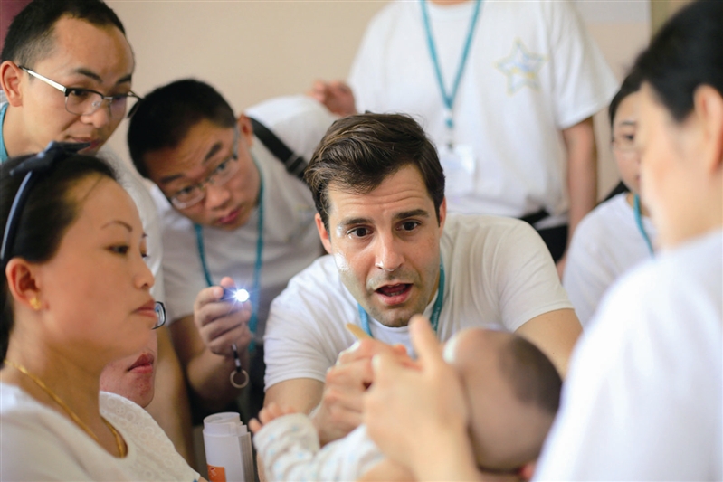 微笑联盟活动中,来自美国的医生为唇腭裂儿童做术前筛查