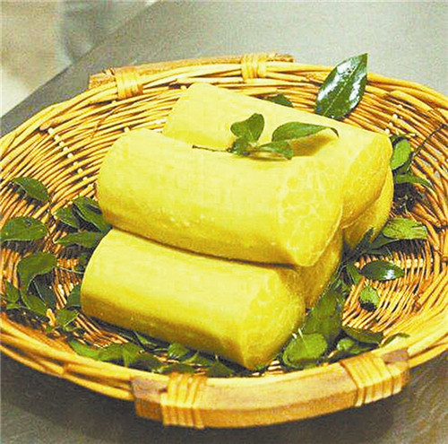 顺溪黄年糕个头比普通年糕要大,它的黄色是来源于山上的一种柴,烧成灰后,用开水烫,再过滤而来,当地人会选用最好的晚稻米,浸泡在这黄水里,最后取出碾成米粉,黄年糕,就是由此而来。这样的工序,顺溪黄年糕已传承了300多年,早些年完全手工,而现在则是半手工制作,毕竟吃货多啊,但口味依然保持着最初的特色。