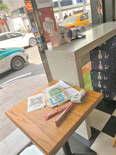 随后,记者在路过开太百货对面的一鸣真鲜奶吧时发现,这家店的防疫现状与记者12日在温医大附一院公园路院区对面的一鸣真鲜奶吧如出一辙,仅摆放了一张摆满防疫物资的小桌子挡在门口,并无工作人员值守。