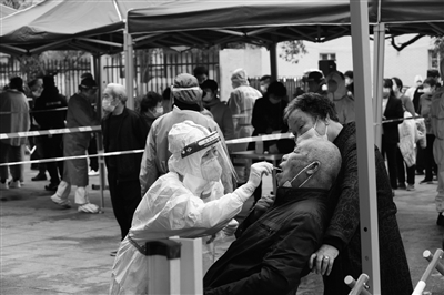76岁的张福媚推着坐轮椅的老伴潘国勋前来做核酸。张崇禹 摄