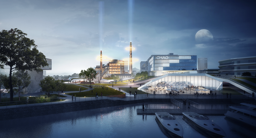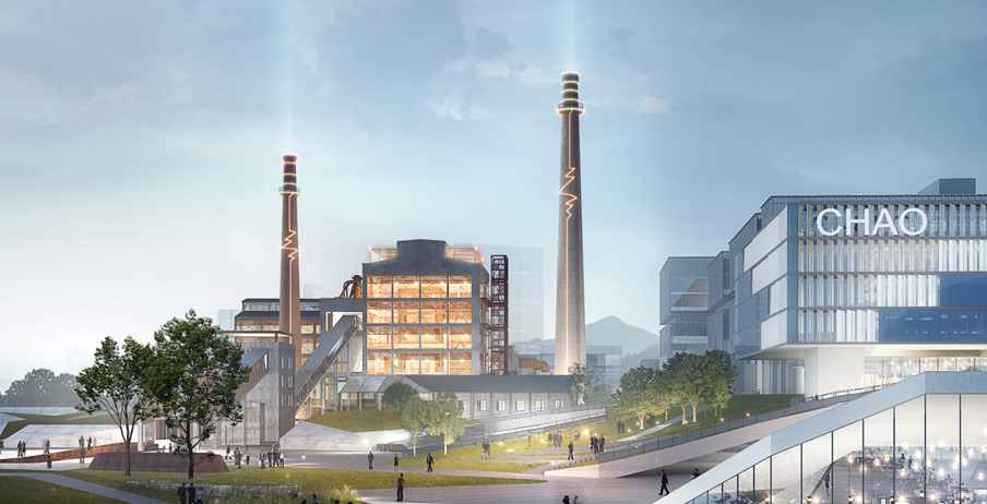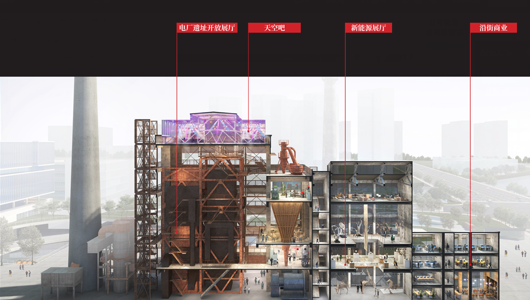 此次开工的二期,是整个项目的核心以及最能体现项目风貌特点的部分,主要涉及电厂主厂房提升,城市客厅、滨水舞台建设,产业招引培育等内容。二期工程将把工业遗存、公园景观、塘河风貌等三者相结合,最大程度保留原有的主厂房、烟囱、设备等,并修复凸显它们的外观形态,对这些建筑的内部空间进行改造提升。同时,围绕城市新兴的消费中心、设计中心、科普教育中心等定位,打造能源博物馆,招引商业购物、文创设计等产业。