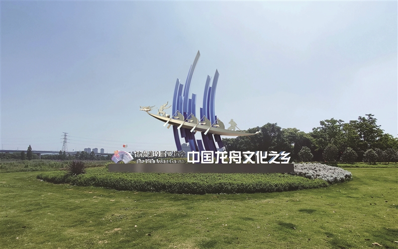 位于宁波路与今汇路交叉口东北角的“中国龙舟文化之乡”雕塑,高12米、宽16.8米,是该区最大的景观小品。其主体部分采用不锈钢烤漆,精工无缝打磨,底部有亚克力发光字“中国龙舟文化之乡”和“杭州第19届亚运会”标识,并以佛甲草、三色堇、满天星等花卉环形妆点,将亚运与龙舟两种元素巧妙融合。
