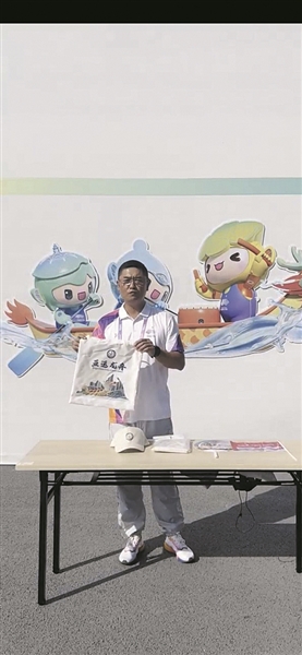 杨选泽介绍观赛物资包 陈明铭/摄