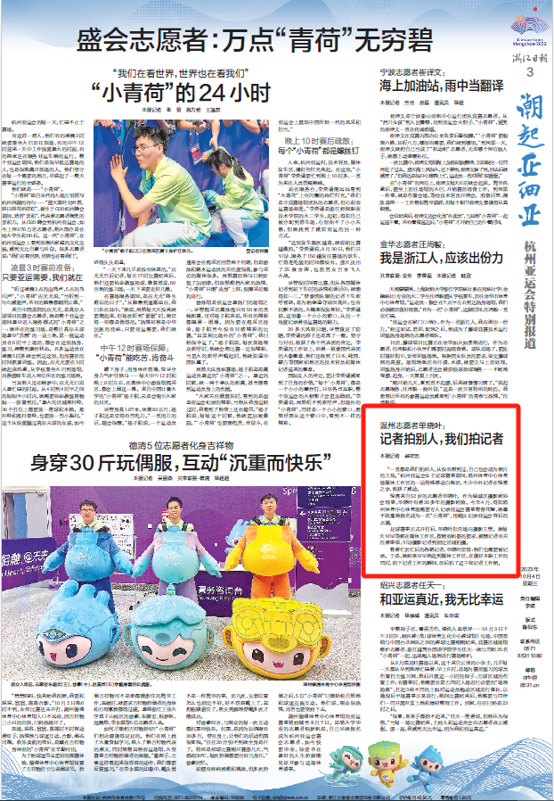 看着眼前忙前忙后的各路记者,单晓叶特别有感触:报道亚运会赛事,对于广大新闻工作者而言,也是整个职业生涯中一段非常难得的经历。然而,他们通过忘我工作,向外界呈现亚运会的精彩瞬间时,往往顾不上为自己留下哪怕片刻画面。