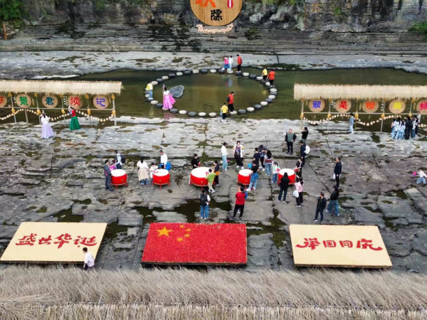 在南浦溪景区,“晒秋”已成了这段时间最出圈的词,沿着蜿蜒的溪水而上,在龙尾滩的空地中,空旷的场地俨然成了“晒秋”的最佳场所,这次“晒秋”活动,比以往更多了几分光彩,早在一个月前,为了庆祝新中国成立75周年,当地的畲族村民用火红如炬、金黄耀眼的辣椒拼出了13.5平方米的五星红旗,以及“盛世华诞 举国同庆”八个大字。不少从杭州、金华、台州前来游玩的游客体验了晒秋中擂大鼓、竹竿舞、捣糍粑等特色活动。