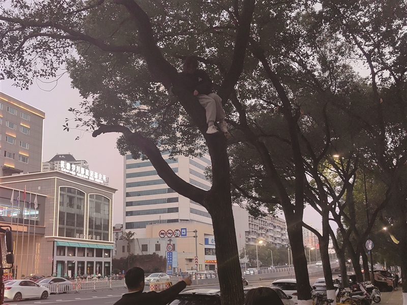 温州网讯 2月4日下午,鹿城区消防救援大队接报称,市区将军大酒店附近有人被困树上。消防救援人员到达现场,发现一名女孩正蹲在树枝上,等待救援。