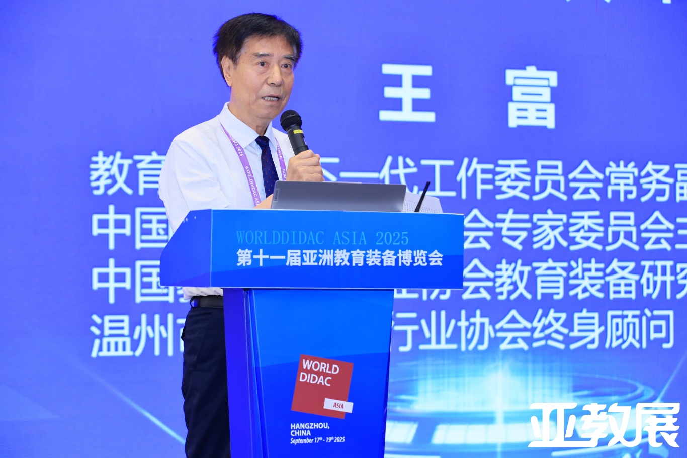 教育部关心下一代工作委员会常务副主任、中国教育装备行业协会专家委员会主任王富应邀到会致辞。他充分肯定了温州教育装备行业的发展和《温州市“人工智能+教育”三年行动计划》的出台,提出智能教育装备要实行跨界融合、资源整合、行业联合、专精结合,实施“四横五纵”的资源布局和AI赋能,其中“四横”基础教育、高等教育、职业教育、终身教育;“五纵”即德育、智育、体育、美育、劳育五育并举。
