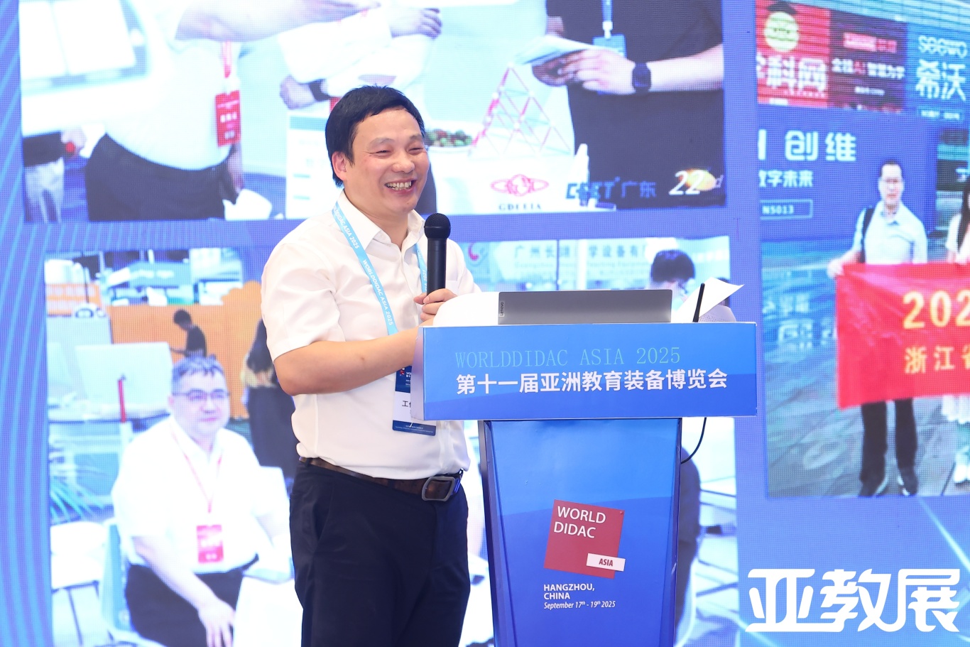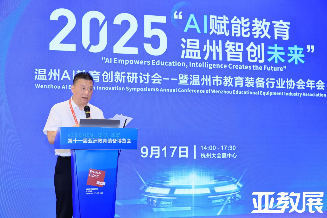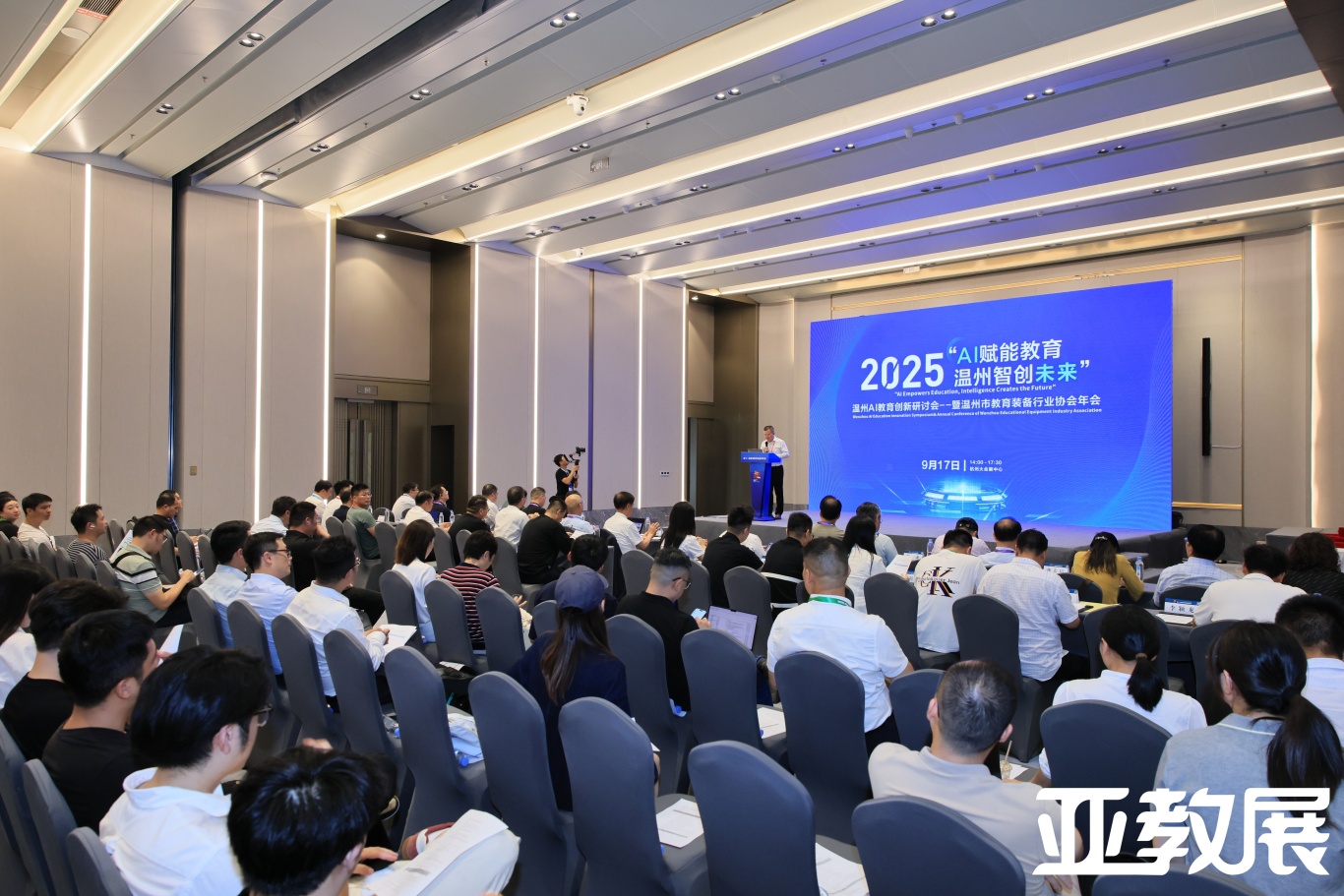 温州网讯 9月17日下午,杭州大会展中心2—201会议室,大咖云集、高朋满座。以“AI赋能教育,温州智创未来”为主题的温州AI教育智造创新研讨会在这里成功举办。本次研讨会借第十一届亚洲教育装备博览会之机,由温州市教育装备行业协会主办,旨在深入推动人工智能与教育深度融合,展示温州作为教育部“智慧教育示范区”的创建成果,为《温州市“人工智能+教育”三年行动计划》的落实聚智聚力,勾勒实施路径。