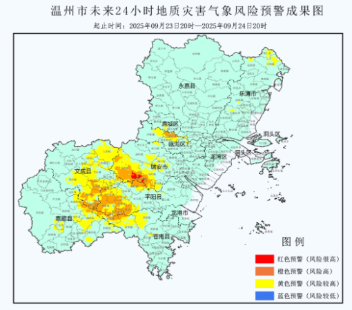 9月23日,温州市自然资源和规划局、温州市气象局联合发布未来24小时地质灾害气象风险等级预报。