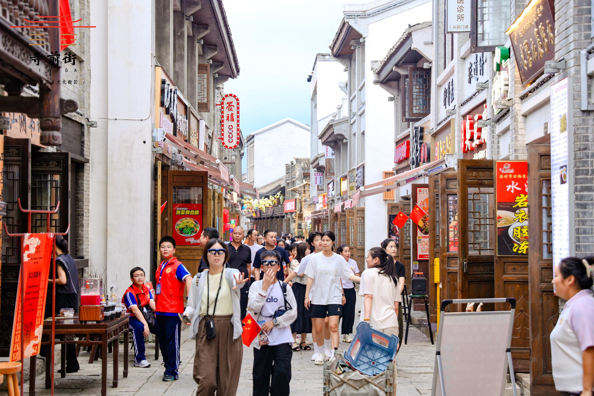 国庆中秋长假首日,永嘉楠溪江景区内,丽水街雅集、潮玩芙蓉等活动现场热闹非凡。游客们身着汉服,穿梭于古色古香的街巷,体验宋韵文化的独特魅力。