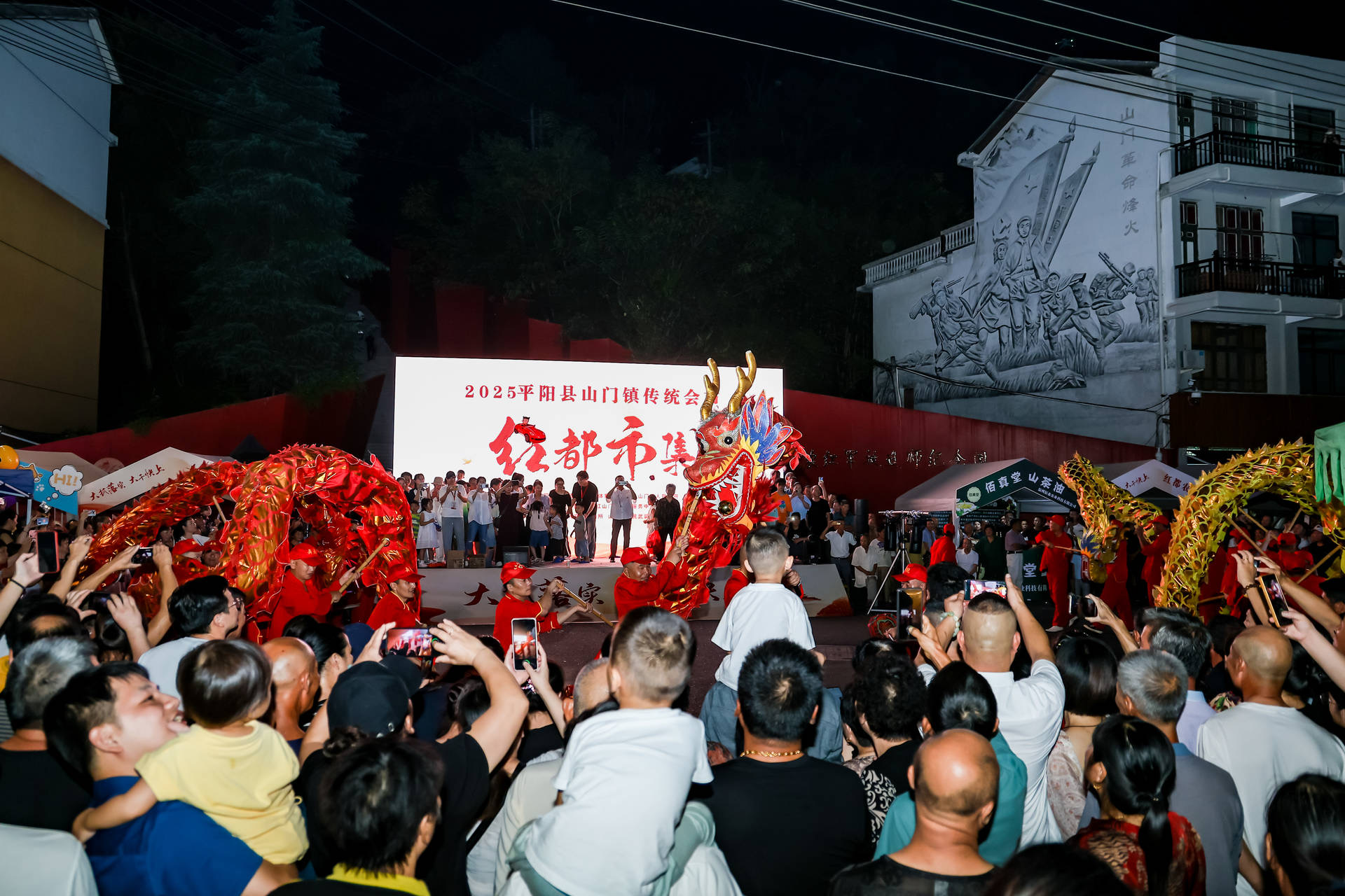 首次亮相的“无添加”平阳黄汤即饮茶和本地精炼山茶油、山谷回荡的流行乐队演出节奏、川剧变脸引来的阵阵喝彩、经典红色电影露天播放、水面上武侠风表演衣袂飘飘、极光秀与瀑布烟花点亮夜空……今年,依托由山门老会市焕新升级而来的“红都市集”,平阳山门精心策划“吃住玩娱购”一站式文旅矩阵,营造别开生面、全域共享的浓郁节庆气氛。“红都市集”举办期间,全域停车免费,违停不处罚。近两天时间里,3万多名游客从四面八方涌来,只为体验这片红色热土焕发的新魅力。