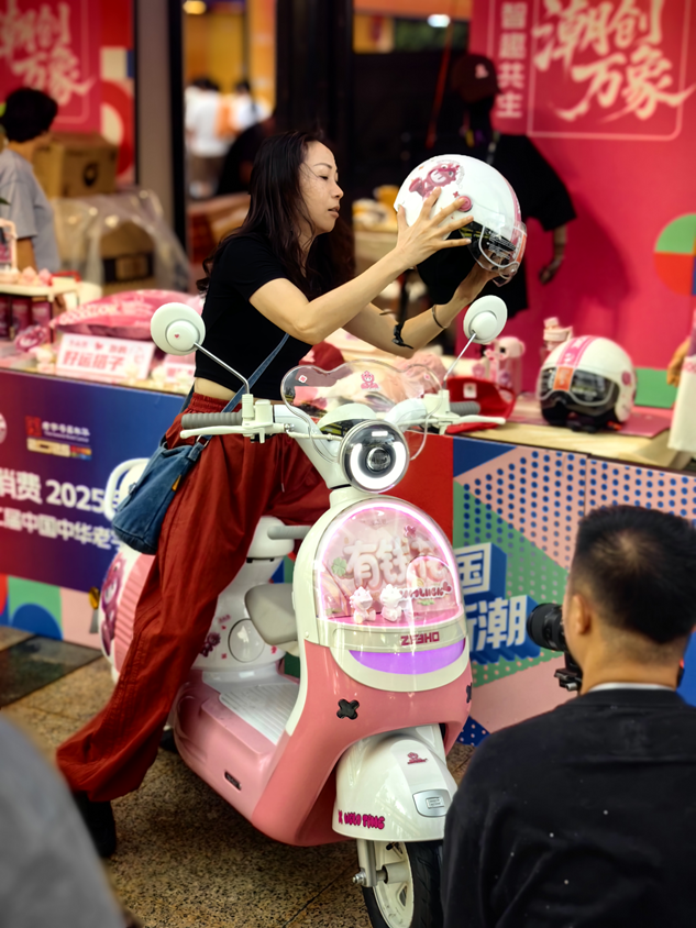 温州网讯 “这辆电动(自行)车多少钱?可以直接买走吗?”10月18日傍晚,林女士来到浙里来消费·2025金秋购物节暨第二十二届中华老字号精品博览会(简称“金秋购物节”)国潮IP“火小义”展位前,一下子就被这辆可爱的“极核”电动自行车所吸引。