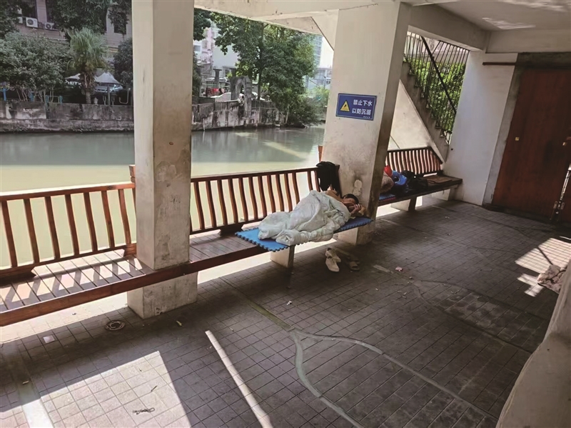乘凉社区湖滨公园坐落于人民中路城开天桥下,紧邻温瑞塘河,地处老城中心枢纽,人流密集。然而,该片区曾一度沦为流浪人员与社会闲杂者的聚集地,环境脏乱、治安管理困难,成为区域治理的一大难点。