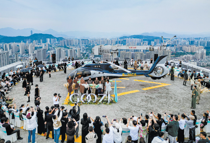 温州网讯 低空产业和时尚产业如何跨界融合?昨天下午,温州华盟大厦停机坪“变身”兼具时尚感与科技感的“云端秀场”,观止服饰最新设计的50套原创作品在高空T台依次亮相。直升机的机械美感与服装的流动线条相映成趣,穿越机在现场穿梭拍摄,无人机载着飞天屏在高空飘荡,炫彩的画面装点了空中舞台。