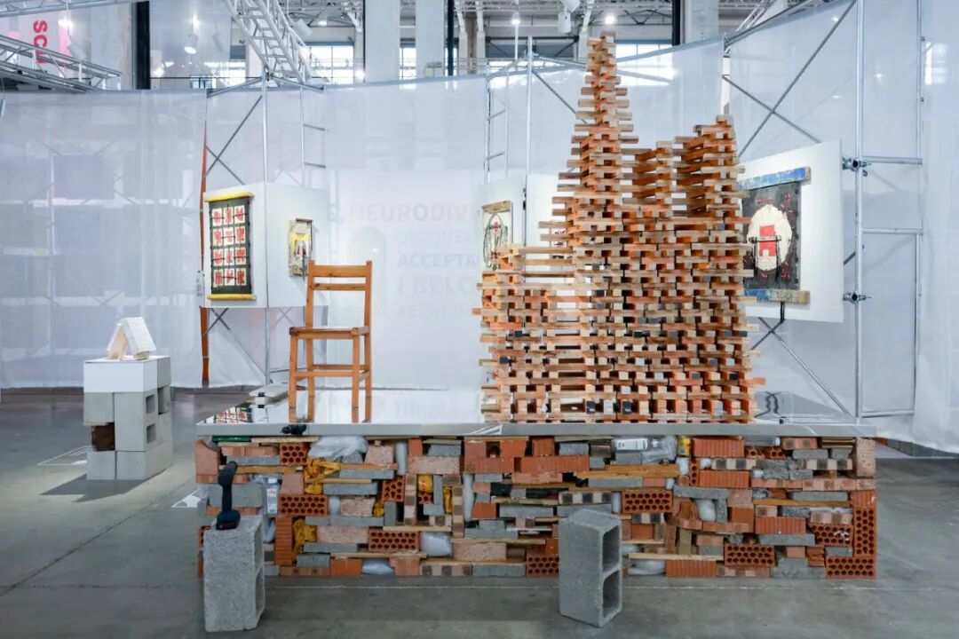 “除了这些作品,整个展区本身也是一件‘再生作品’。这四块学院介绍板由2023年参展时的桌面板打磨改造而成,入口处的装饰品来自废瓶子和订书机盒。撤展后,这些材料都将被拆解回收,用于下一次展览,真正实现‘循环落地’。”策展团队成员、温州肯恩大学建筑与设计学院教师刘唱介绍,团队刻意避开购买新材料的惯性,从温州肯恩大学建筑与设计学院大楼的施工废料中搜集可用材料,小到纸浆展签,大到砖块木料。“我们不介意材料上‘脏’的印记,这些痕迹是它们生命的证明,未来它们还会在不同场域延续价值。”